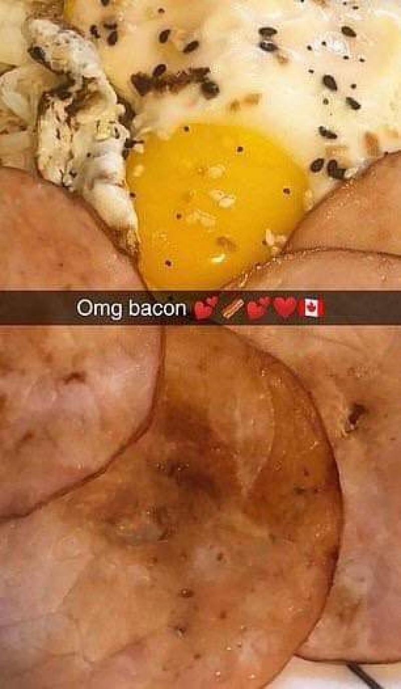 ونشرت رهف صورتين لها عبر “سنابشات” خلال تواجدها في أحد المطاعم في مدينة تورنتو، إحداهما وهي تحمل قهوة من “ستاربكس”، وتظهر فيها بفستان قصير، والأخرى صورة لطبق من اللحم علقت عليه: “يا إلهي إنه لحم خنزير مقدد”.