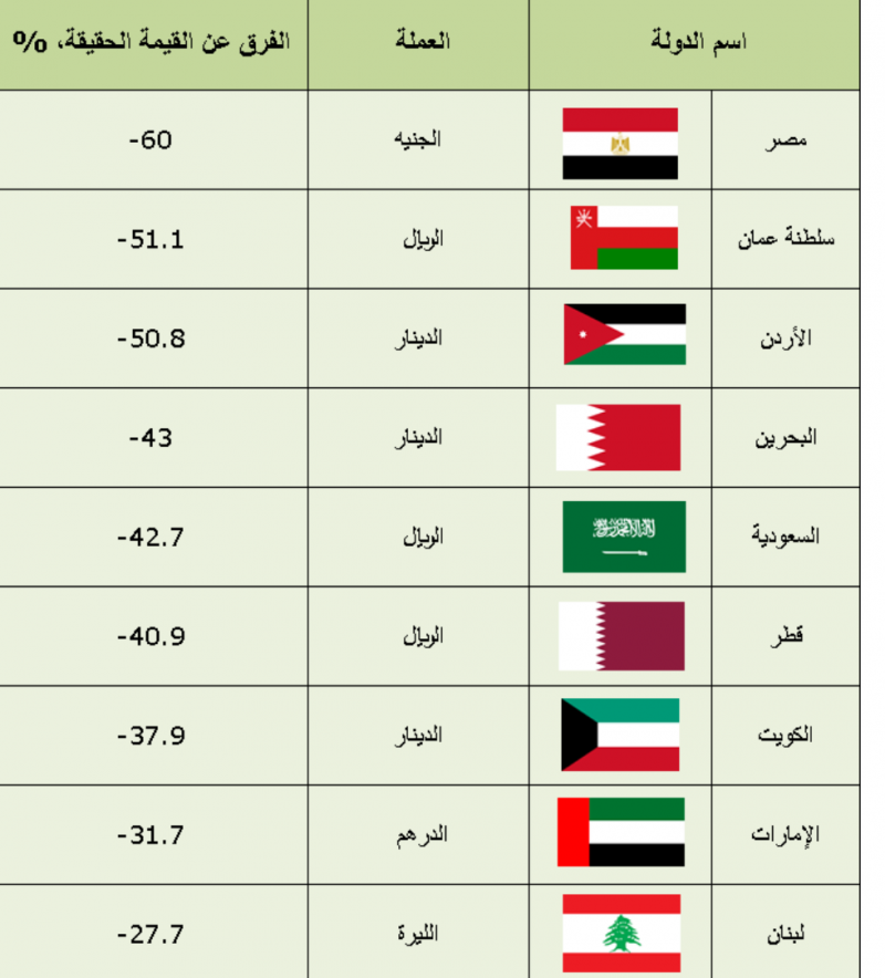 وفيما يلي جدول يظهر تقييم العملات العربية مقابل الدولار حسب مؤشر “بيغ ماك”.