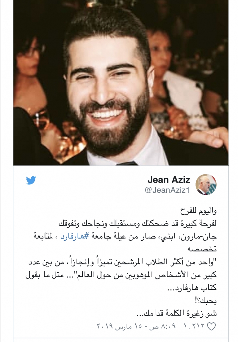 وكتب عزيز”: اليوم للفرح.. لفرحة كبيرة قد ضحكتك ومستقبلك ونجاحك وتفوقك”، مضيفًا: “جان-مارون، ابني، صار من عيلة جامعة هارفارد ، لمتابعة تخصصه”.