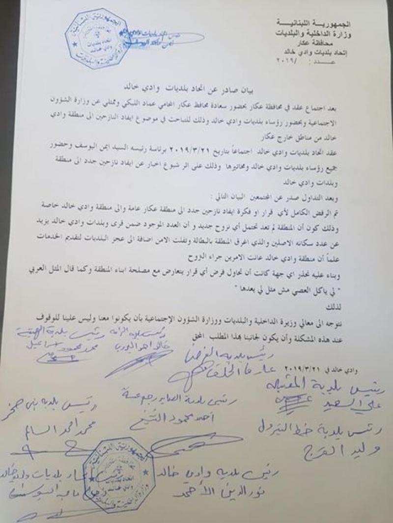 وأكد بيان إتحاد بلديات وادي خالد “ان العدد الموجود ضمن قرى وبلديات وادي خالد يزيد عن عدد سكانه الاصليين والذي أغرق المنطقة بالبطالة وتفلّت الامن، إضافةً الى عجز البلديات عن تقديم الخدمات”.