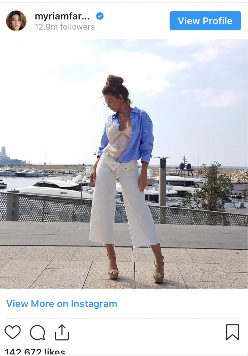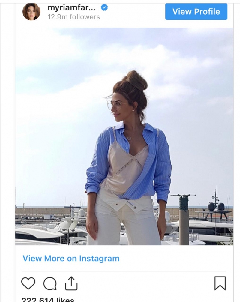 وظهرت ميريام في صورة نشرتها عبر حسابها الخاص على تطبيق انستغرام بإطلالة صيفية مختلفة وجريئة عبارة عن قميص صيفي باللون الأزرق الفاتح وخطوط بيج وارتدت فوقه قميص خفيف يشبة قميص النوم باللون البيج بطريقة متداخلة بين القطعتين، ونسقت معهما بنطال ابيض تركت ازراره مفتوحة، في موضة غير متوقعة منها.