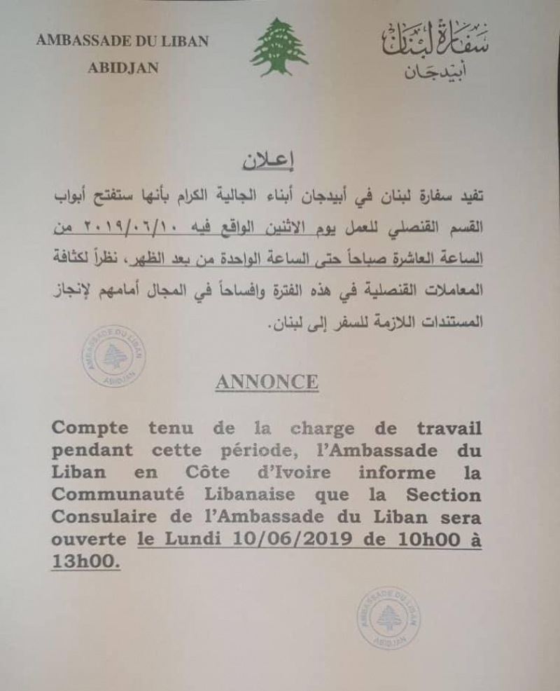 أبيدجان:إعلان صادر عن السفارة اللبنانية