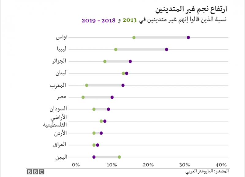 كشف الاستطلاع أنّ نسبة الذين يصفون أنفسهم بأنهم “غير متدينين” ارتفعت منذ العام 2013 من 8 في المئة إلى 13 في المئة. وفي لبنان، جاءت النسبة متقاربة بين العامين، إذ ارتفعت بنسبة طفيفة، وهي مقدرة بنحو 10%. ولم يشذ عن هذه القاعدة إلا اليمن، الذي انخفضت فيه نسبة “غير المتدينين” من 12 في المئة في عام 2013 إلى 5 في المئة في عام 2019.
