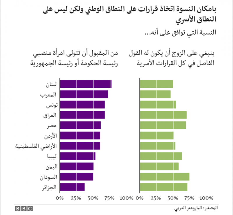 ولكن الأمر يختلف عندما يتعلق بتوازنات القوى في الحياة اليومية، إذ أن أغلبية المشاركين – بما في ذلك معظم النسوة – يعتقدون أنه ينبغي للزوج أن يكون له القول الفصل في القرارات الأسرية. وشهد لبنان زيادة طفيفة في نسبة النسوة اللواتي يعتنقن هذا الرأي منذ عام 2017، وتبين أن المغرب هو البلد الوحيد في المنطقة الذي يرى أقل من نصف سكانه أنه من حق الزوج أن يكون له القول الفصل في المنزل.