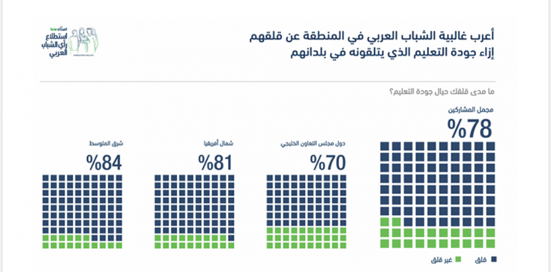 على مستوى التعليم في المنطقة، أكّد 3 من أصل 4 شبان وشابات عرب عدم رضاهم عن التعليم في بلدانهم، وأكثر من نصفهم يرغبون باستكمال تعليمهم في دول الغرب.