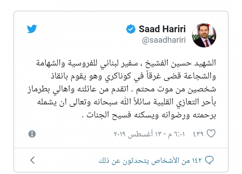 غرّد رئيس الحكومة سعد الحريري، عبر حسابه الخاص على تطبيق “تويتر”: “الشهيد حسين الفشيخ ، سفير لبناني للفروسية والشهامة والشجاعة قضى غرقاً في كوناكري وهو يقوم بانقاذ شخصين من موت محتم . اتقدم من عائلته واهالي بطرماز بأحر التعازي القلبية سائلاً الله سبحانه وتعالى ان يشمله برحمته ورضوانه ويسكنه فسيح الجنات”.