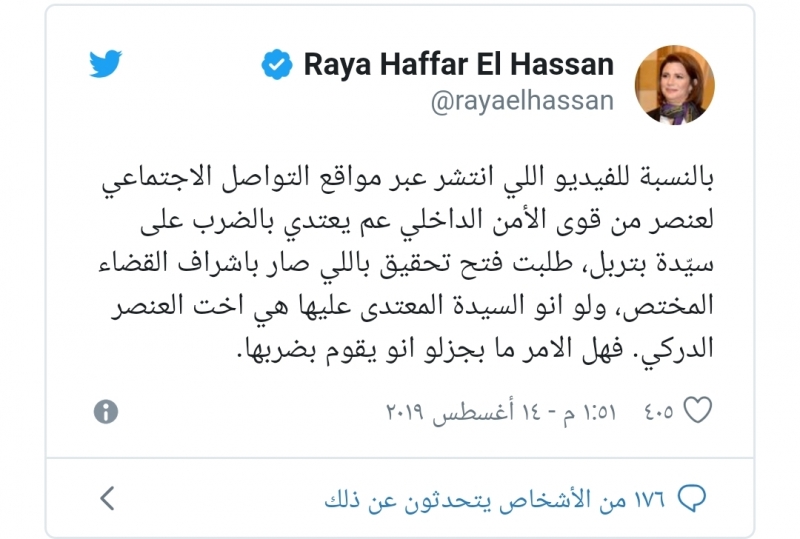 كما علقت وزيرة الداخلية ريا الحسن على صفحتها عبر موقع “تويتر”: “بالنسبة للفيديو اللي انتشر عبر مواقع التواصل الاجتماعي لعنصر من قوى الأمن الداخلي عم يعتدي بالضرب على سيّدة بتربل، طلبت فتح تحقيق باللي صار باشراف القضاء المختص، ولو انو السيدة المعتدى عليها هي اخت العنصر الدركي. فهل الامر ما بجزلو انو يقوم بضربها”.