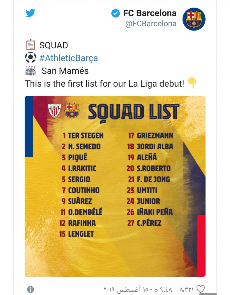 بينما ظهرت الصفقات الجديدة جريزمان، وجونيور فيربو، وفرينكي دي يونج، وأيضًا لاعب فريق الشباب كارليس بيريز.