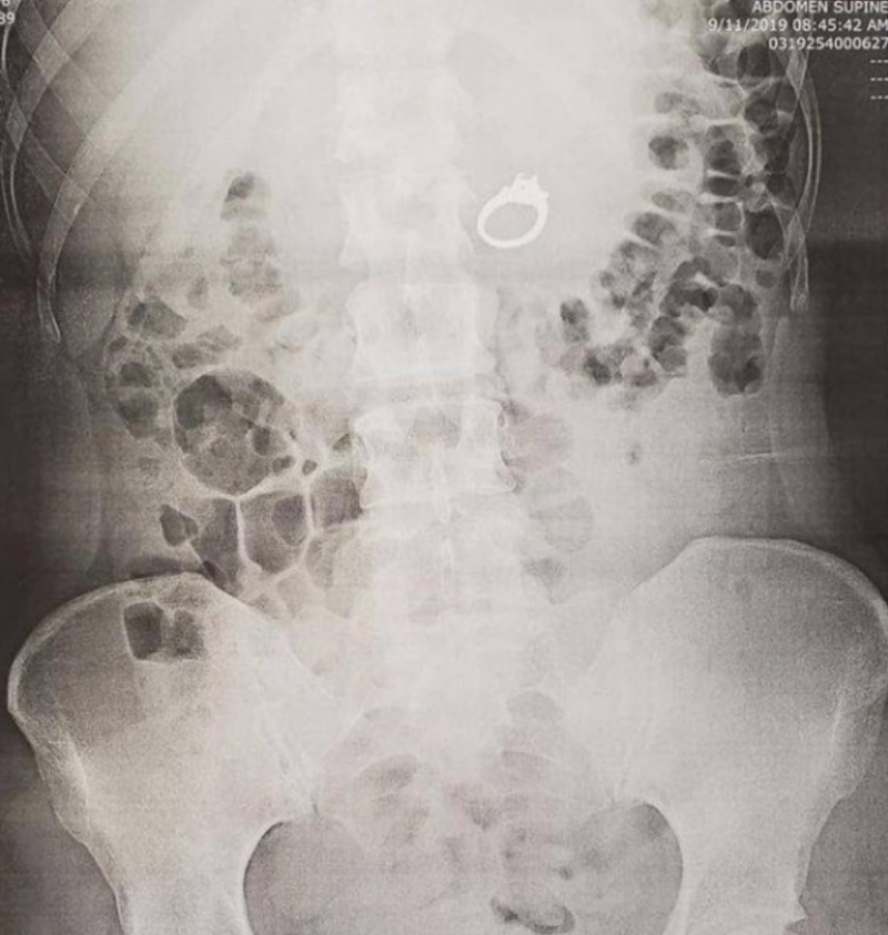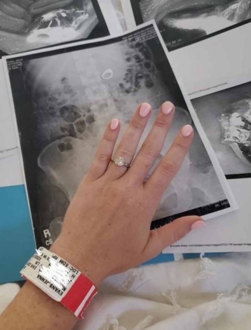 وأوضحت جينا أن الطبيب أمر بإجراء الأشعة السينية وبدأت تشعر بالصدمة إلى حد ما عندما عادت إلى الطبيب، واكتشفت أن الأشعة تظهر مكان وجود الخاتم بأمعائها.