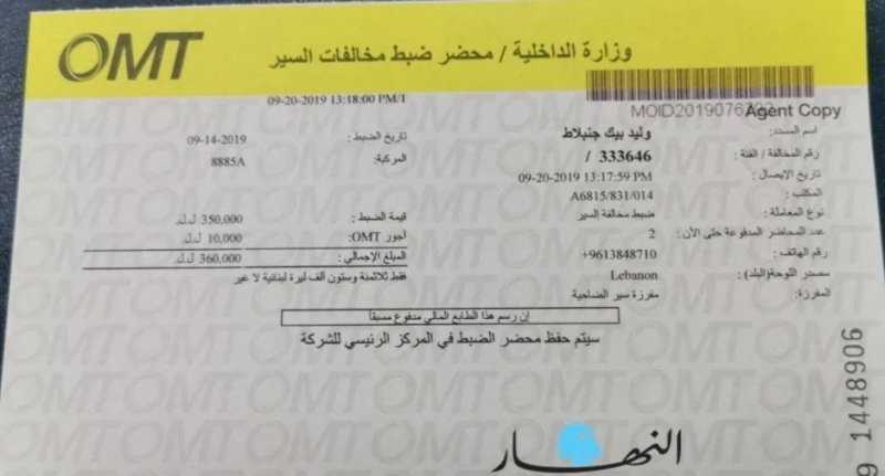 نشرت صحيفة “النهار” عبر موقعها الالكتروني صورة لوصل ضبط سرعة باسم رئيس الحزب التقدمي الاشتراكي وليد جنبلاط سُطّر بتاريخ 14 أيلول الحالي وبقيمة 360 ألف ليرة وقد دفعه اليوم في مركز “أو أم تي”. المصدر : النهار lbci