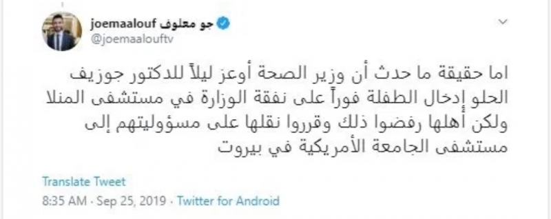 غرد الاعلامي جو معلوف عن قضية الطفلة سيلا خضر نيوف وغرد عبر تويتر قائلا: “تم تداول خبر أن الطفلة سيلا خضر نيوف ابنة الست سنوات في طوارئ مستشفى المنلا منذ اربع ساعات والمستشفى ترفض استقبالها بعد تعرضها لطلق ناري عن طريق الخطأ واصابها الخردق في عيونها وهي بحاجة لعملية جراحية فورية.ويقول ذووها انها الان في طوارئ المنلا التي ترفض علاجها” . ثم تابع موضحاً: اما حقيقة ما حدث أن وزير الصحة أوعز ليلاً للدكتور جوزيف الحلو إدخال الطفلة فوراً على نفقة الوزارة في مستشفى المنلا ولكن أهلها رفضوا ذلك وقرروا نقلها على مسؤوليتهم إلى مستشفى الجامعة الأميركية في بيروت.