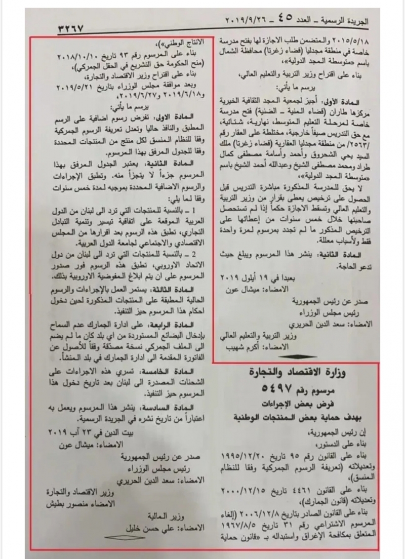 دخلت رسوم الحماية للمنتجات والصناعات اللبنانية حيّز التنفيذ، بعد نشرها في الجريدة الرسمية في عددها الصادر يوم الخميس في 26 أيلول 2019 بالمرسوم رقم ٥٤٩٧ المتعلق بفرض بعض الإجراءات بهدف حماية بعض المنتجات الوطنية.