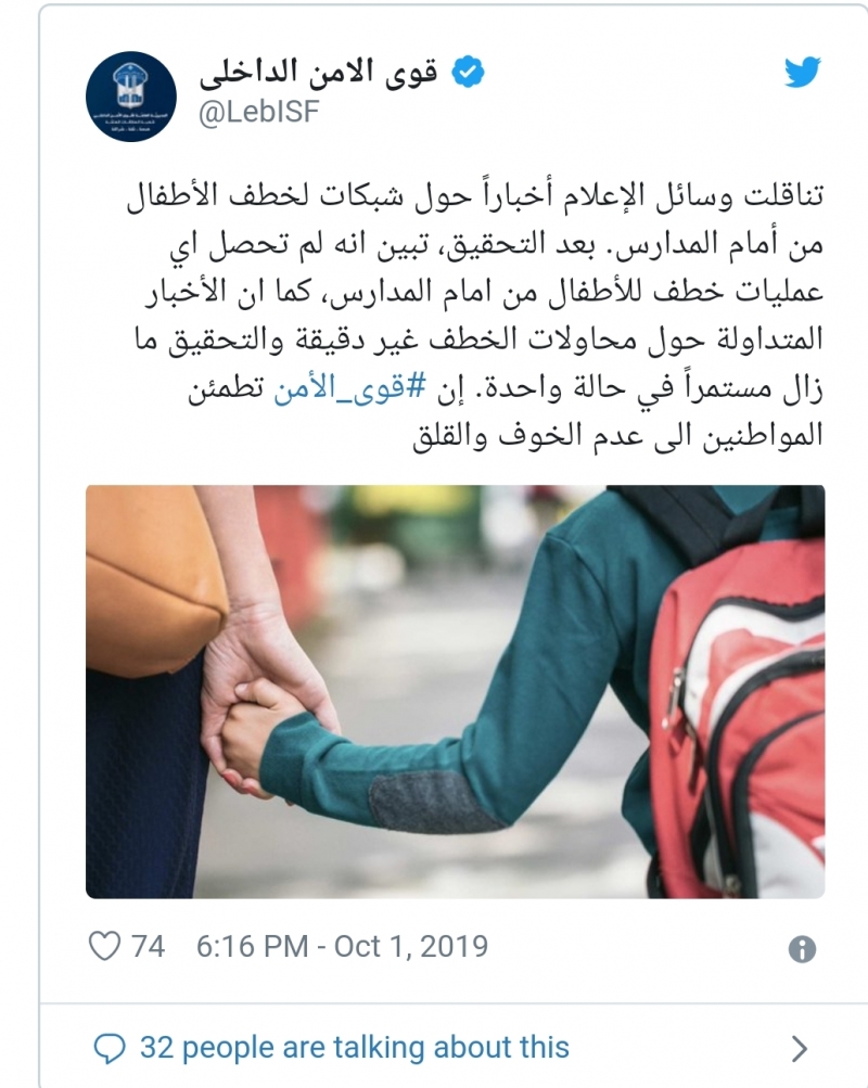 تناقلت وسائل الإعلام أخباراً حول شبكات لخطف الأطفال من أمام المدارس. بعد التحقيق، تبين انه لم تحصل اي عمليات خطف للأطفال من امام المدارس، كما ان الأخبار المتداولة حول محاولات الخطف غير دقيقة والتحقيق ما زال مستمراً في حالة واحدة. إن #قوى_الأمن تطمئن المواطنين الى عدم الخوف والقلق