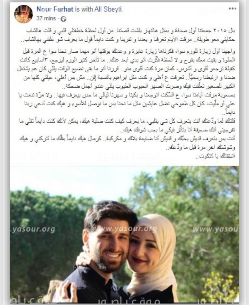 على صفحتها على موقع التواصل الاجتماعي "فيسبوك"، نشرت الشابة نور فرحات، تستذكر زوجها الذي خطفه السرطان قبل أيام: