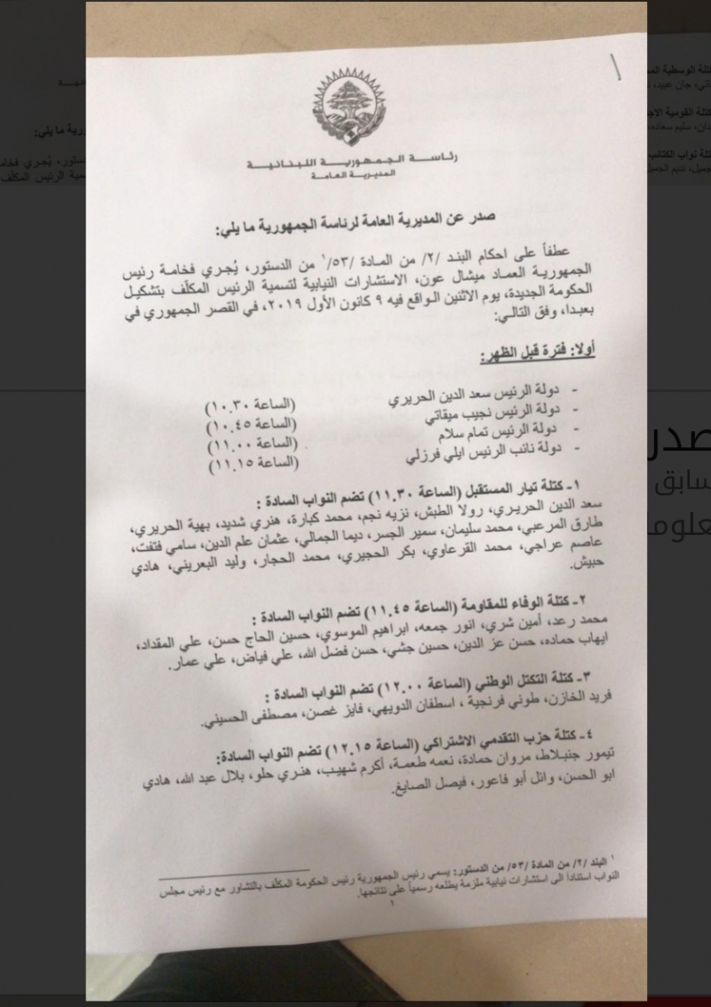 صدر عن المديرية العامة لرئاسة الجمهورية ما يلي: عطفا على أحكام البند 2 من المادة 53 من الدستور، يجري فخامة رئيس الجمهورية العماد ميشال عون، الاستشارات النيابية لتسمية الرئيس المكلف بتشكيل الحكومة الجديدة الاثنين المقبل.