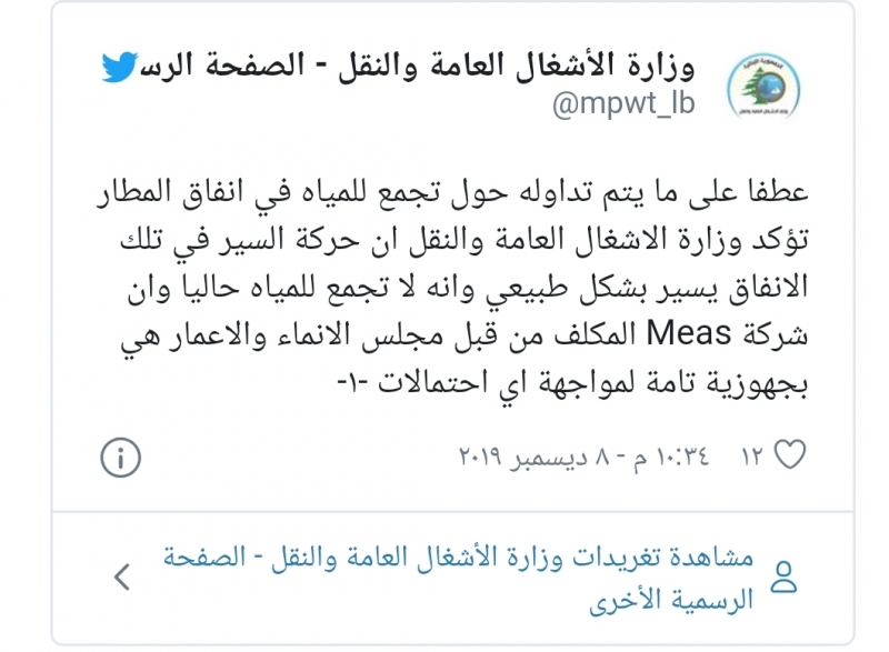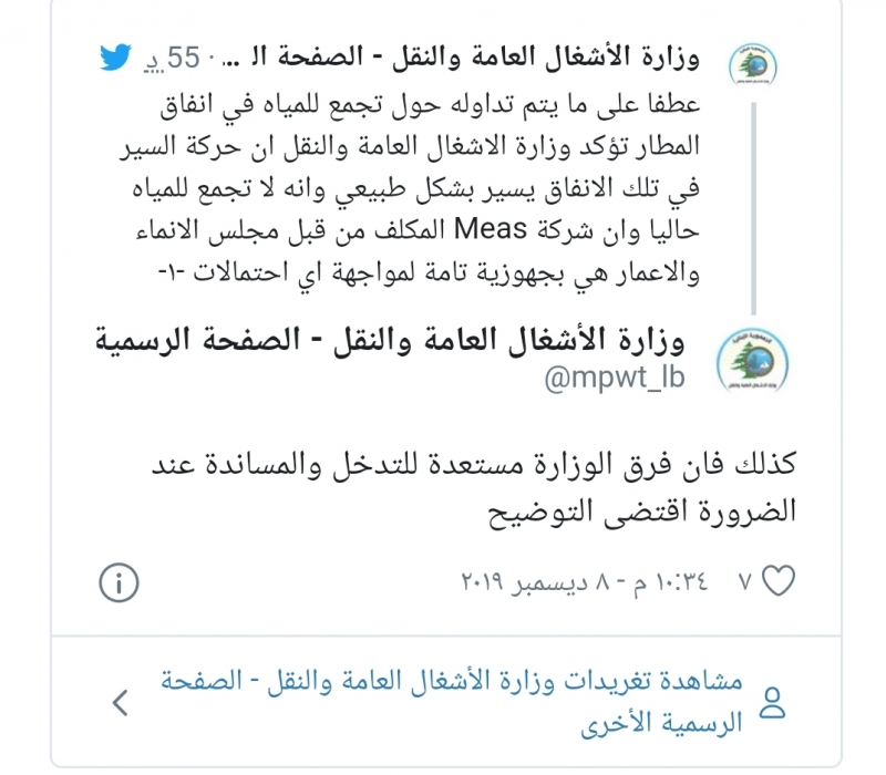 “عطفا على ما يتم تداوله حول تجمع للمياه في انفاق المطار”، أكدت وزارة الاشغال العامة والنقل، في تغريدة على حسابها على موقع تويتر، ان حركة السير في تلك الانفاق تسير بشكل طبيعي وان لا تجمع للمياه حاليا”.