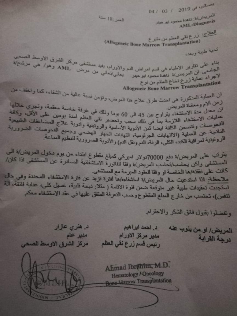 تناقلت عائلة الشابة "ناهدة أبو حيدر" (18 سنة) مناشدة أليمة لمساعدتهم في تأمين كلفة عملية طارئة. فناهدة، التي تعاني من سرطان الدم منذ 4 سنوات وتخضع لعلاجه الأليم في مستشفى سيدة المعونات في جبيل، بحاجة لعملية زرع نخاع عظم و المتبرع موجود، الا أن ما يحول دون ذلك هو عجزهم عن تأمين كلفة العملية التي بالكاد تبلغ ٢٦ الف دولار