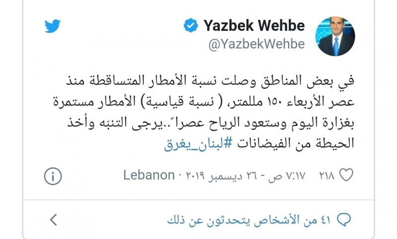 على حسابه على موقع التواصل الاجتماعي “تويتر”، غرّد الإعلامي في “LBCI”، يزبك وهبي قائلاً: ” في بعض المناطق وصلت نسبة الأمطار المتساقطة منذ عصر الأربعاء 150 مللمتر، ( نسبة قياسية) الأمطار مستمرة بغزارة اليوم وستعود الرياح عصراً.. يرجى التنبّه وأخذ الحيطة من الفيضانات”.