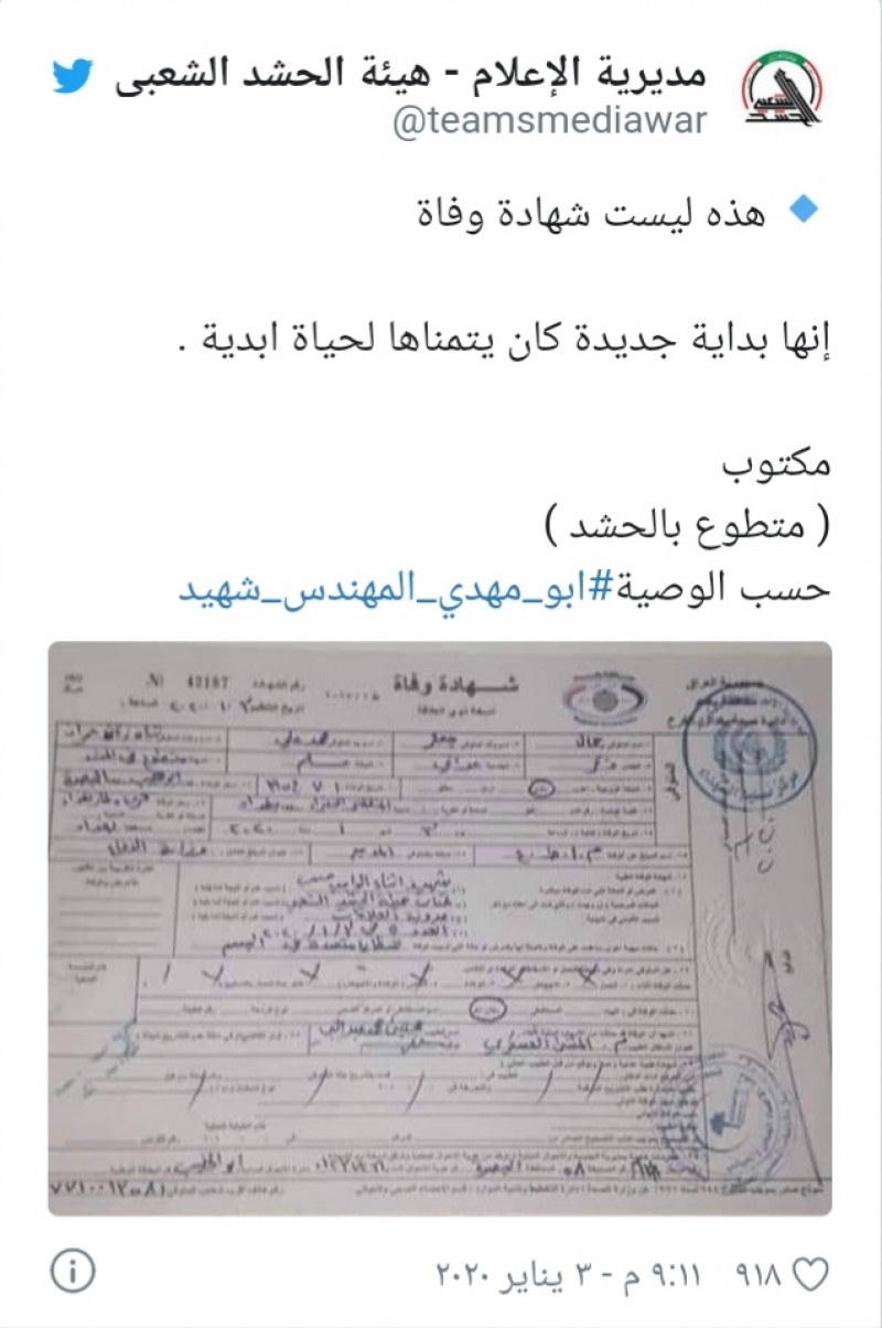 نشر موقع “الحشد الشعبي” على صفحته في “تويتر”، صورة لشهادة وفاة نائب رئيس الهيئة أبو مهدي المهندس، الذي قضى في عملية اغتيال قاسم سليماني قائد فيلق القدس الإيراني فجر الجمعة.