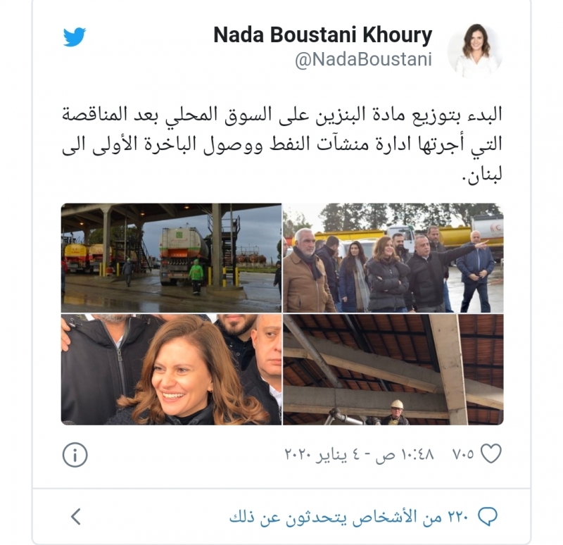 أشارت وزيرة الطاقة في حكومة تصريف الاعمال ندى البستاني في تصريح لها خلال تسلم الدفعة الأولى لمادة البنزين بعد المناقصة التي أجرتها إدارة منشآت النفط لصالح الدولة الى أن “الهدف من بدء الدولة استيراد البنزين هو ادخالها الى هذا القطاع”، مشيرة الى أن “الباخرة الاولى التي وصلت تبلغ حمولتها 24 ألف طن وبقية الحمولة ستصل في بواخر أخرى قادمة”، مشددة على ان “الحمولة في الباخرة ستوزع على محطات البنزين وعلى الجيش اللبناني الذي سيكون من ابرز الزيائن”.
