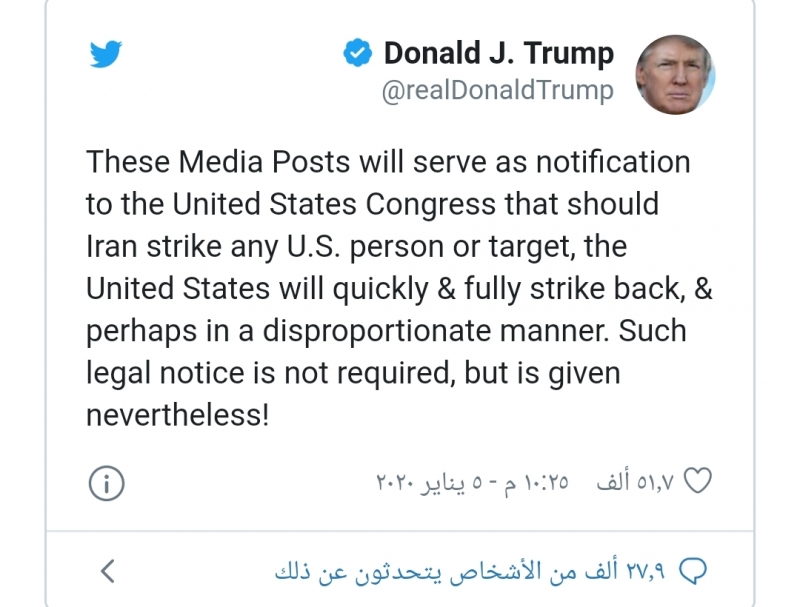 ترامب في تغريدة جديدة: أميركا سترد بشكل سريع وكامل إذا هاجمت إيران أي فرد أو هدف أميركي