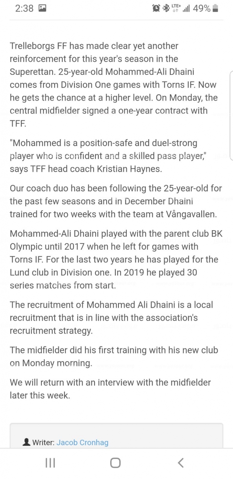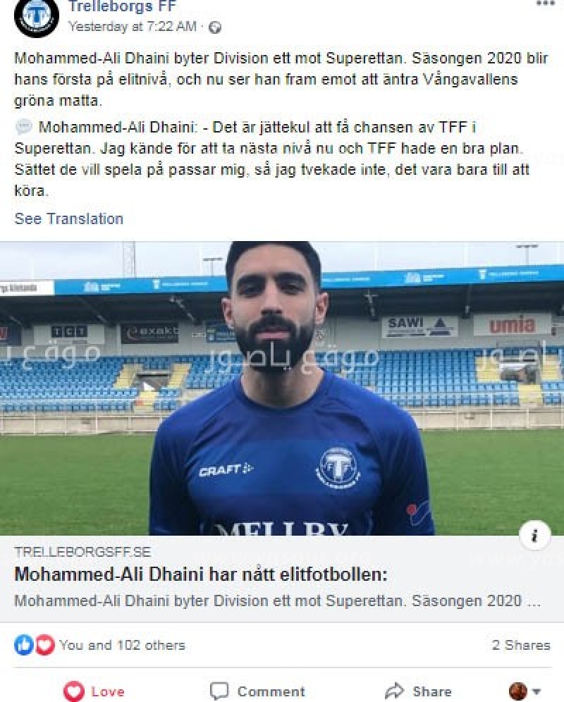 نشرت صفحة الفيسبوك الرسمية التابعة لفريق Trelleborgs-FF السويدي خبر توقيع اللاعب اللبناني محمد علي دهيني (25 سنة، من بلدة جباع الجنوبية) عقد احتراف مع الفريق بعد أدائه المميز في الموسم الماضي في الدرجة الأولى. دهيني الذي سيكون لاعب خط الوسط للفريق، سيمثل فريقه في الدوري السويدي Superettan gلموسم الرياضي الجديد الذي سينطلق في شهر نيسان.