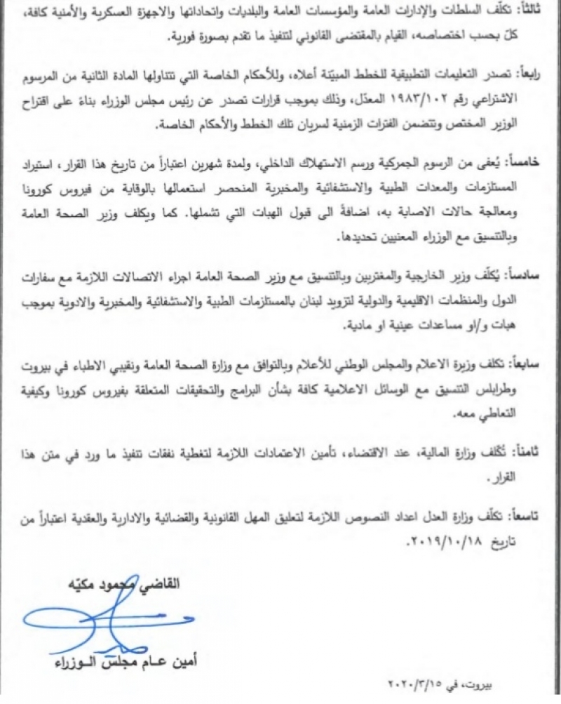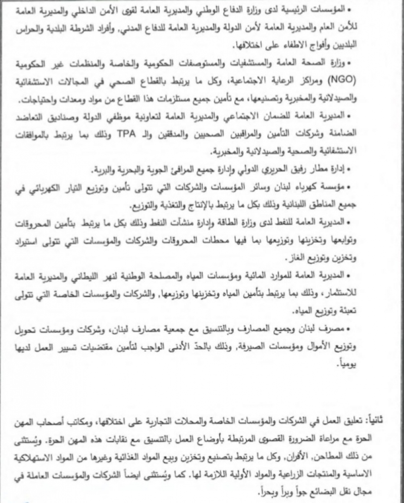 وتابعت "كما قرر إقفال الادارات والمؤسسات العامة والبلديات واتحاداتها والمصالح المستقلة والجامعات والمدارس الرسمية والخاصة والحضانات وذلك على اختلافها، إضافة إلى اقفال المؤسسات الخاصة باستثناء المطاحن والأفران وكل ما يرتبط المواد الغذائية الأساسية كما تستثنى المؤسسات الخاصة بنقل البضائع