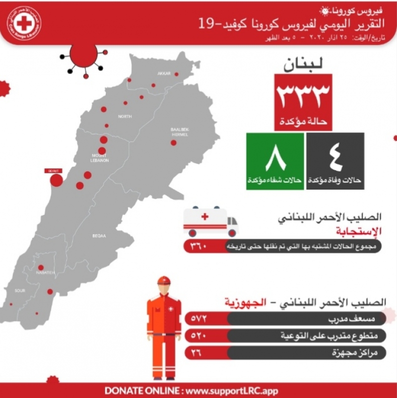 نشر الصليب الأحمر اللبناني في تغريدة على حسابه عبر "تويتر"، التقرير اليومي لفيروس "كورونا".