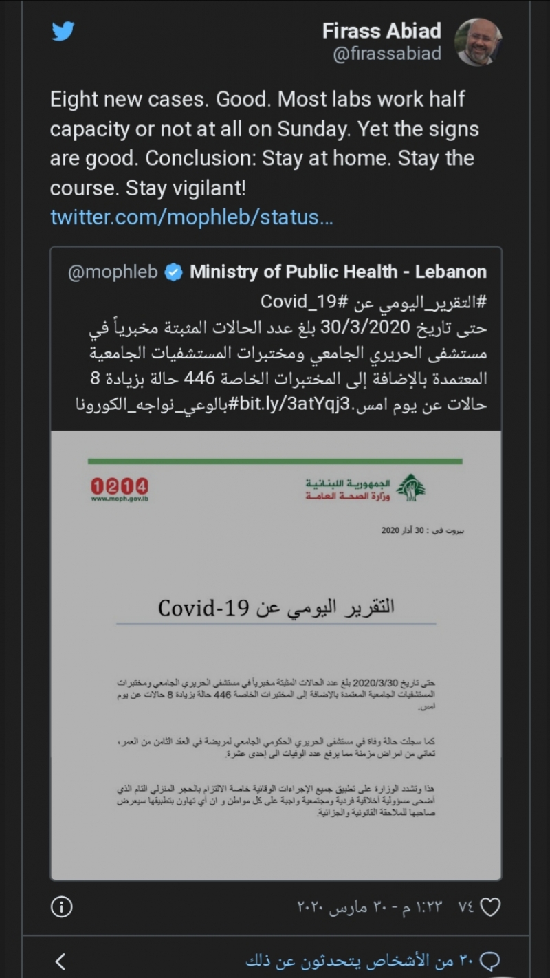 علق مدير مستشفى رفيق الحريري الجامعي على تسجيل 8 اصابات جديدة بفيروس كورونا في لبنان اليوم الاثنين، "8 حالات جديدة. امر جيد. معظم المختبرات تعمل بنصف طاقاتها او لا تعمل كليا يوم الأحد. ورلكن الاشارات مطمئنة. بالنتيجة، ابقوا في بيوتكم وتابعوا على هذا المنوال. ابقوا حذرين".