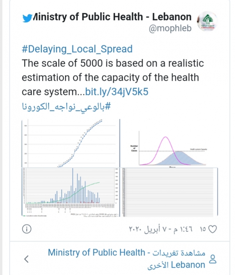 نشرت وزارة الصحة العامة، في تغريدة على حسابها عبر "تويتر"، رسمًا بيانياً يُظهِرُ تأخير الإنتشار المحلي لفيروس "كورونا" والعدد اليومي والتراكمي للحالات الإيجابية.