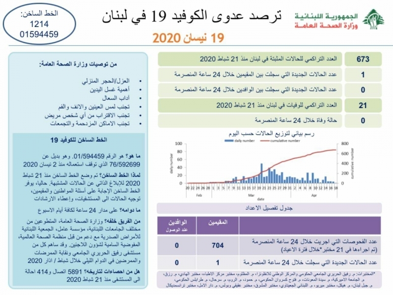 اعلنت وزارة الصحة اللبنانية عن تسجيل اصابة واحدة جديدة فقط بفيروس كورونا ليرتفع العدد الإجمالي إلى 674 وذلك في استمرار للاخبار الجيدة التي تسجل ارقام منخفضة في الاصابات الجديدة منذ بداية الاسبوع الماضي.