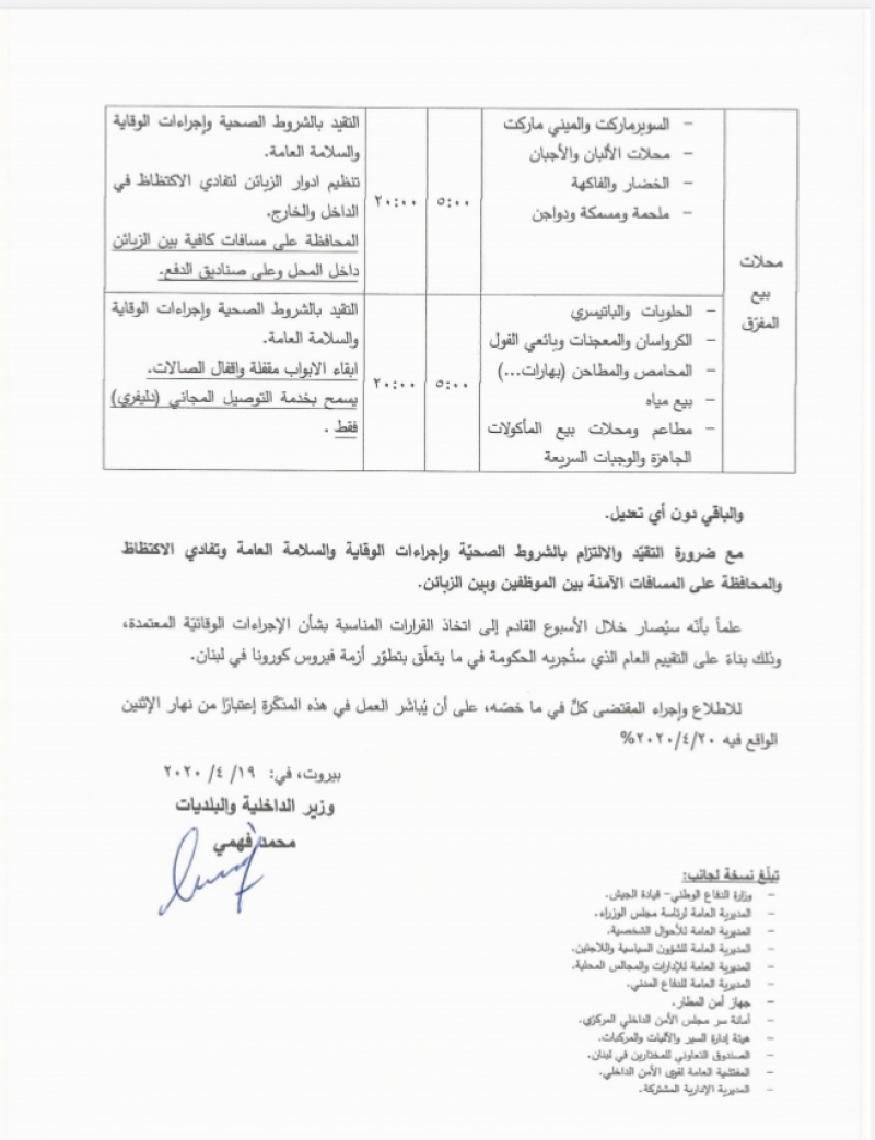 اصدر وزير الداخلية والبلديات محمد فهمي مذكرة عدل بموجبها توقيت حظر التجوال، ليصبح من الثامنة مساء بدل السابعة، كما عدل توقيت الفتح والأقفال للمؤسسات المستثناة من التعبئة العامة. وجاء في المذكرة: