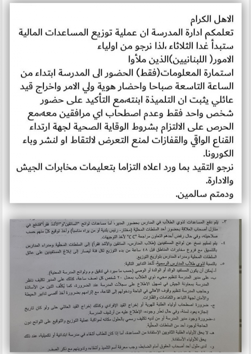 عملاً بقرارات مجلس الوزراء، ستنطلق غداً المرحلة الأولى من توزيع المساعدات المالية على أولياء أمور طلاب المدارس الرسمية في منطقة صور، اسوة بغير من المناطق، عند الساعة التاسعة من صباح غد في المدارس والمتوسطات الرسمية، بإشراف الجيش، على أن يتم التنسيق بين اولياء الأمور ومدراء المدارس كل في منطقته للشروط المتوجبة على الأهل قبل توجههم الى المدرسة.