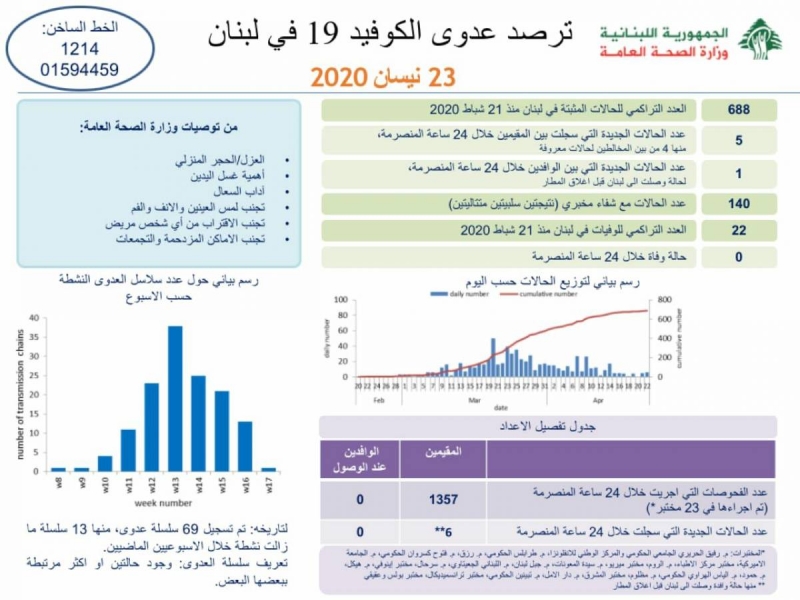 سجلت وزارة الصحة العامة 6 إصابات جديدة بكورونا، رفعت العدد التراكمي إلى 688 حالة.