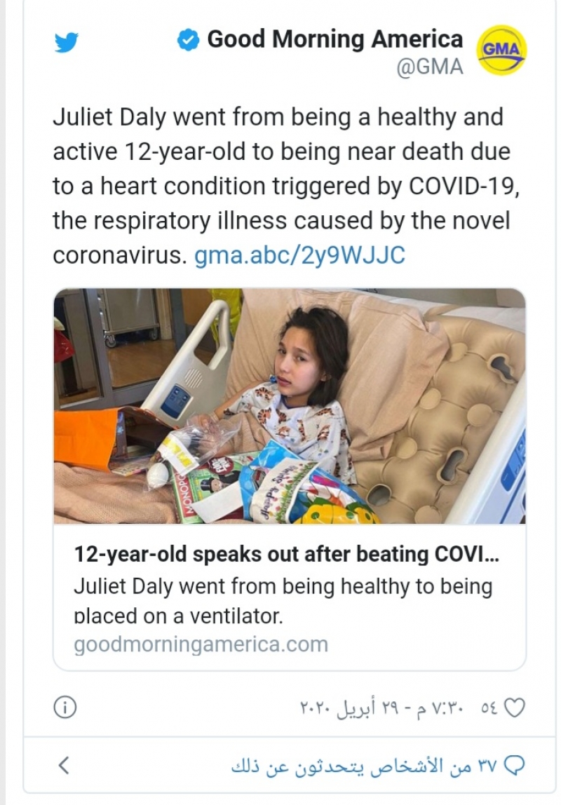 وأوضح طبيبها أنّ حالة القلب النادرة للفتاة سببها الالتهاب الناجم عن تأثير الفيروس. وأضاف: "يمكن أن يصيب "كوفيد-19" القلب ويُسبب في بدء موت خلاياه."