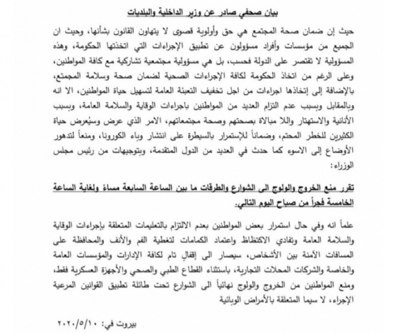 أصدر وزير الداخلية والبلديات محمد فهمي بيان هام جاء فيه ان تقرر منع الخروج والولوج الى الشوارع والطرقات ما بين السابعة مساء ولغاية الخامسة فجراً من صباح اليوم التالي.