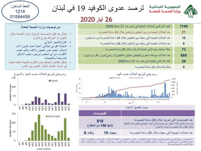 سجلت وزارة الصحة العامة 21 حالة كورونا جديدة، رفعت العدد التراكمي الى 1140 اصابة.
