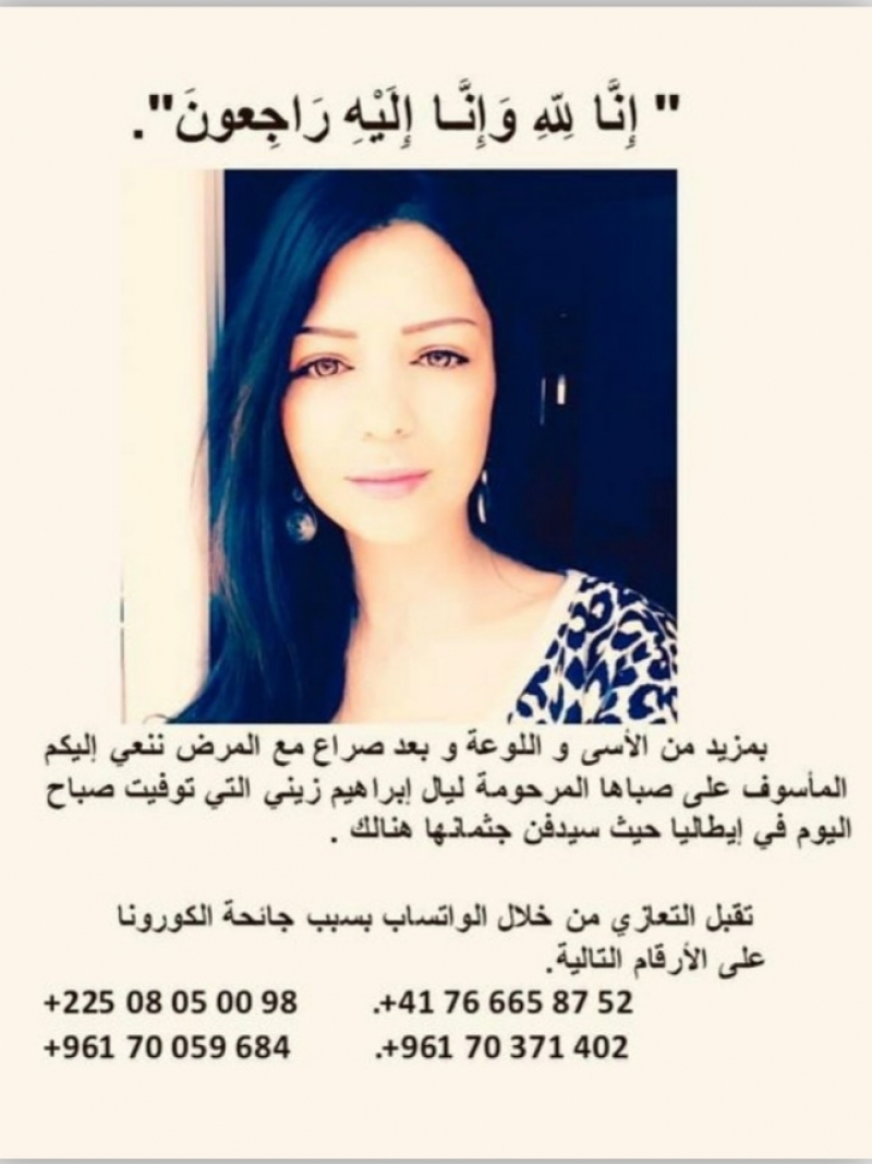 إنتقلت إلى رحمته تعالى فقيدة الصبا الغالية المرحومة ليال ابراهيم زيني(25 عاما) ابنة مدينة صور.