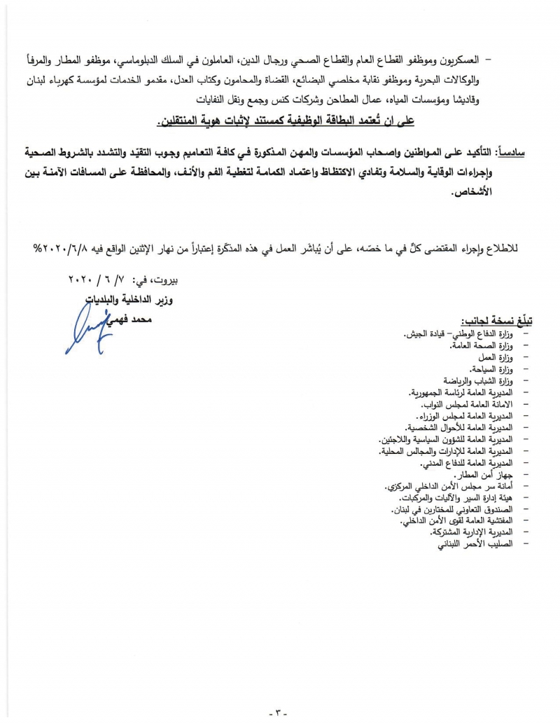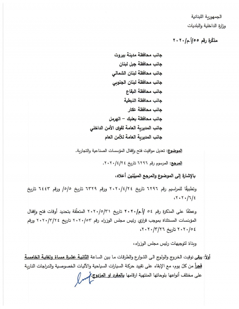 اصدر وزير الداخلية والبلديات محمد فهمي مذكرة عدل بموجبها مواقيت الفتح والإقفال للمؤسسات الصناعية والتجارية كالآتي: