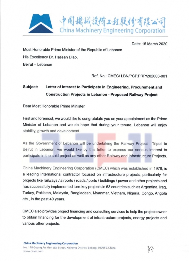 -تنفيذ مشروع سكّة حديد تربط طرابلس بخلدة، وفي الخطة الثانية تصل الى الناقورة. وهنا يوضح شلهوب أننا وضعنا بيد رئيس الحكومة رسالة من بنك (Of china) بقيمة مليار دولار، يبدي استعداده لتمويل هذا المشروع. يوم غد الجمعة هناك موعد سيجمعني مع وزير الأشغال ميشال نجار لمناقشته في هذا الأمر، على أمل ان يكون هناك تجاوب جدي وسريع. أكثر من ذلك، يلفت المتحدّث الى أنه ولكي نُكمل هذا المشروع ويصل في الخطة الثانية الى الناقورة يجب أن تُنجز العديد من الخرائط والدراسات التنفيذية التي تتطلب 6 ملايين دولار، وقد قدّمت الصين استعدادها لدفع هذا المبلغ في حال كانت الدولة لا تملك، على أن تنفّذ الصين المشروع بقيمة تتراوح بين ثلاثة وأربعة مليارات دولار.