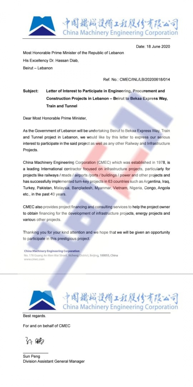 منذ حوالى الشهر، يقول شلهوب، أحضرت شخصياً كُتب العروضات الصينية الموجّهة باسم رئيس الحكومة الدكتور حسان دياب، وطلبت موعداً رسميا للقائه وسلمته إياها. المشكلة برأي شلهوب تكمن في الجانب اللبناني الذي على الدوام يتلقى الرسائل لكنّه يُبقيها بلا رد، الأمر الذي يضرب مصداقية لبنان مع الصين. ويوضح شلهوب أنّه وخلال لقائه برئيس الحكومة -وهو على الصعيد الشخصي كان متجاوبا جداً- عرضت عليه جملة مشاريع من ضمنها:
