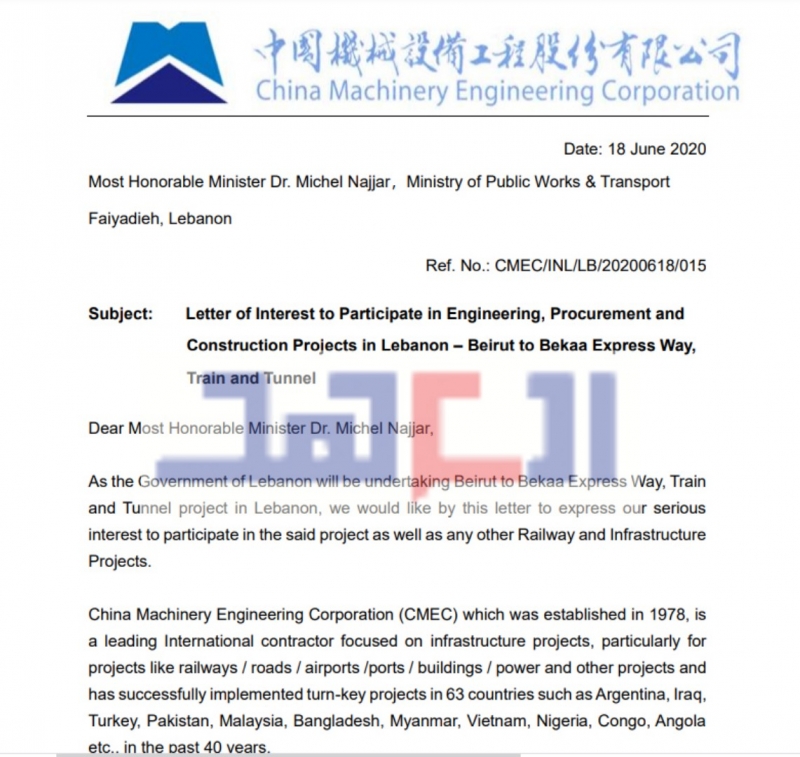 ويتطرّق المتحدّث الى نفق شتورا-بيروت الذي أقر في مجلس النواب. هذا النفق تبدي الصين كل استعداد لتمويله على طريقة الـbot وبمليارات الدولارات. ويكشف شلهوب أنّ الشركات الصينية أرسلت اليوم الخميس كتباً رسمية جديدة لكل من رئيس الحكومة ووزير الأشغال تختص باهتمام الصين لتنفيذ مشروع نفق شتورا-بيروت، بعدما كانت قد أخذت موافقة مبدئية. وتعرب عن استعدادها للتعاون في مشاريع بنى تحتية وطاقة وغيرها.