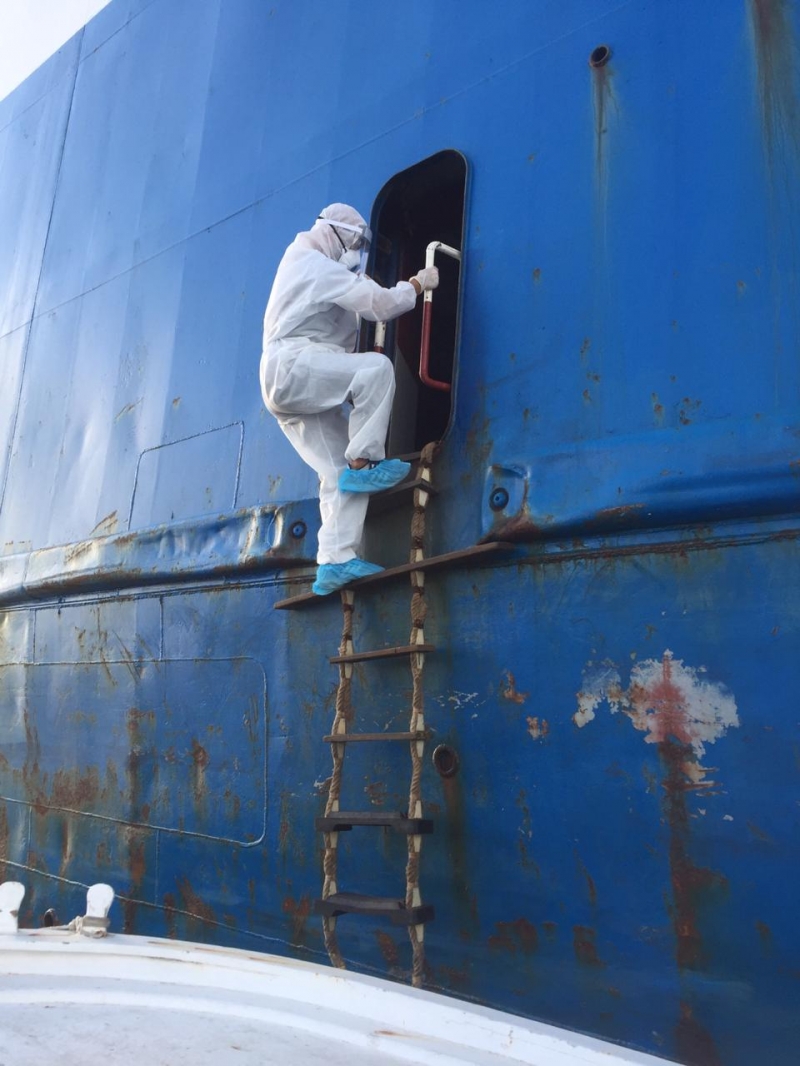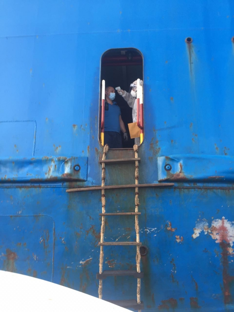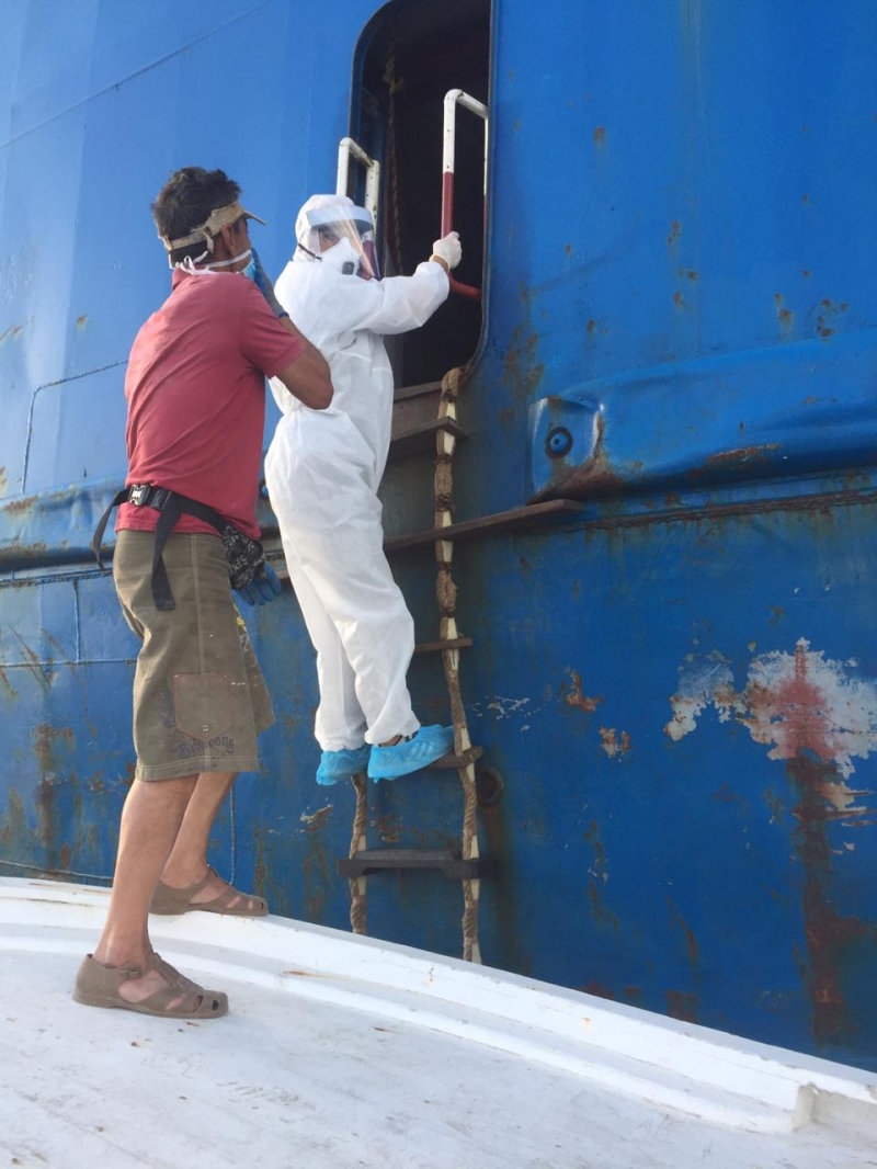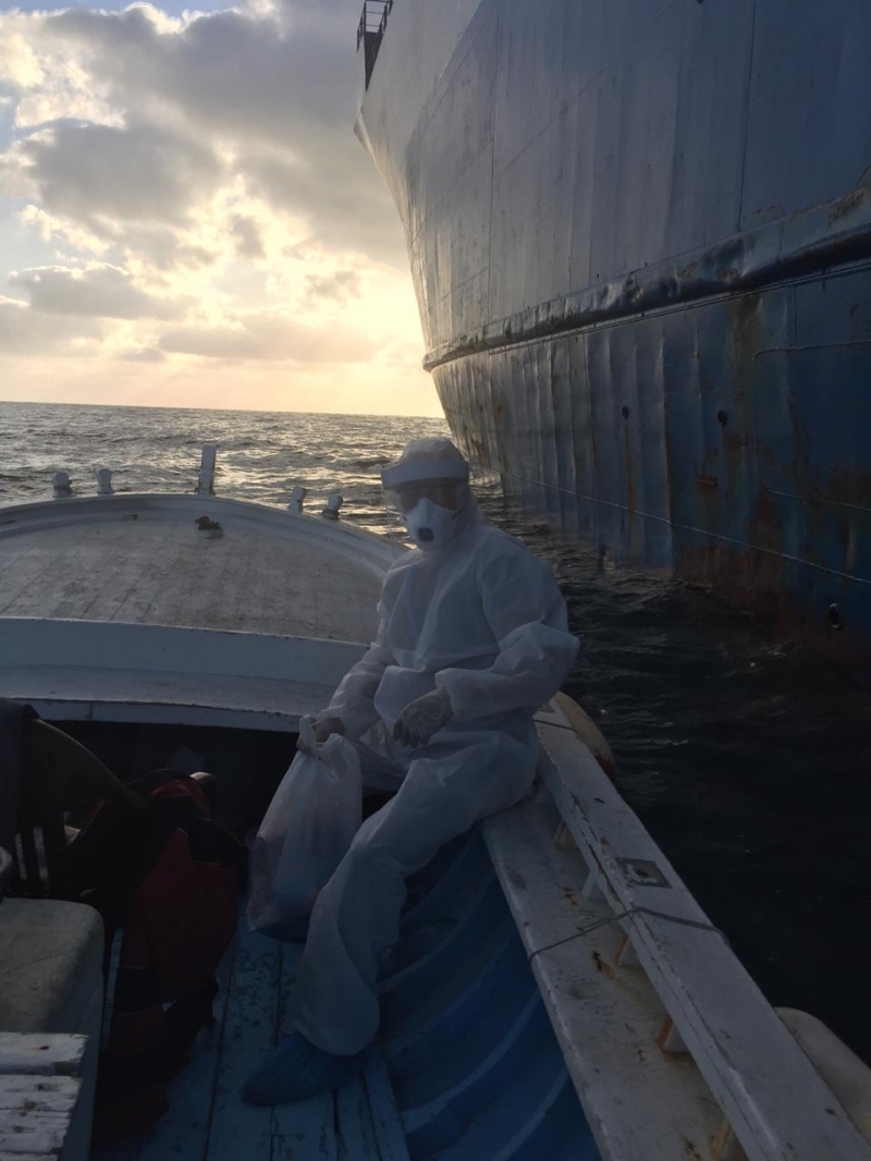 ضمن مجهود وزارة الصحة في ضبط الوضع ومنع انتشار الوباء..كشف المراقب الصحي في دائرة الحجر الصحي في مرفأ صور (محمد بيضون) على الباخرة Nivine في عرض البحر قبل السماح لها بالرسو في حرم المرفأ