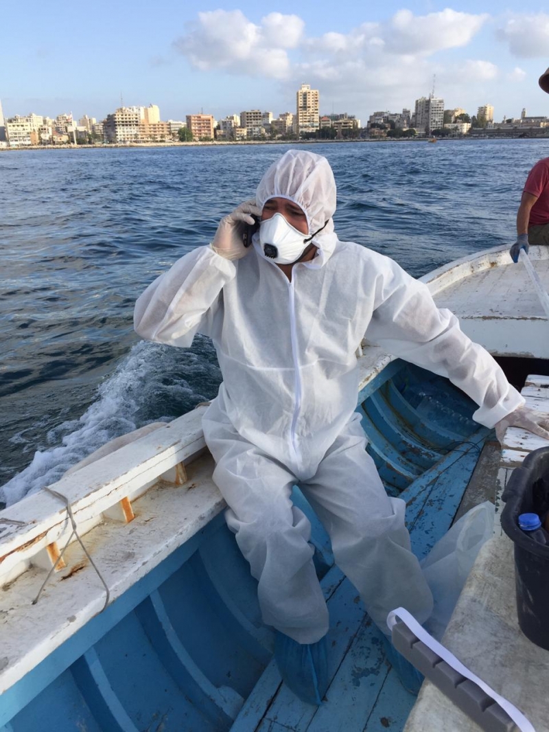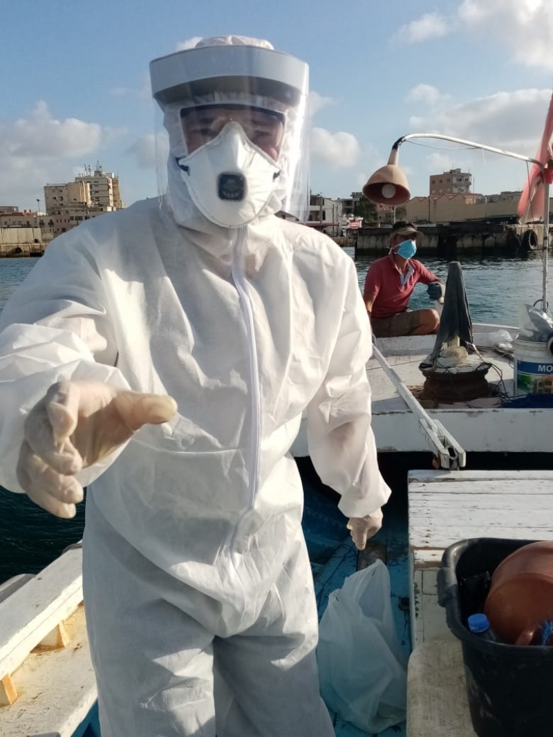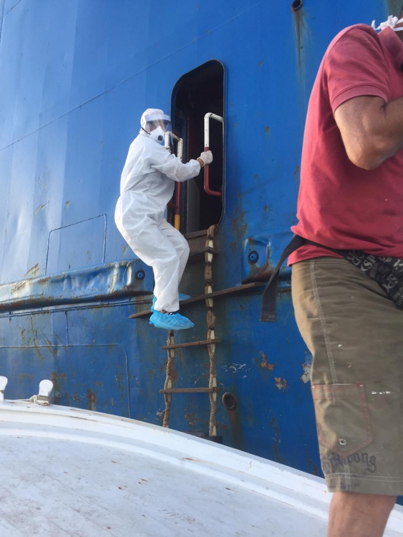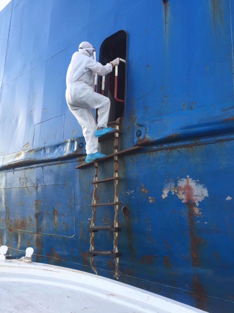 ضمن مجهود وزارة الصحة في ضبط الوضع ومنع انتشار الوباء..كشف المراقب الصحي في دائرة الحجر الصحي في مرفأ صور (محمد بيضون) على الباخرة Nivine في عرض البحر قبل السماح لها بالرسو في حرم المرفأ