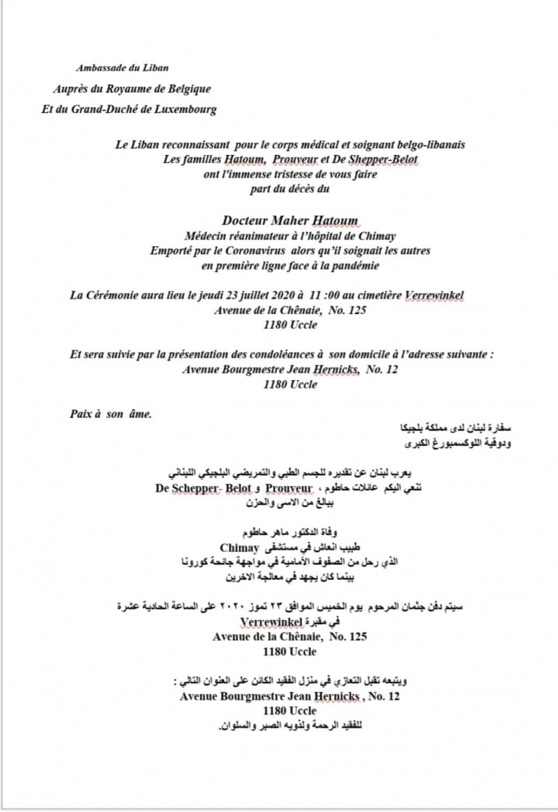 توفي في بلجيكا الطبيب اللبناني ماهر محمد باقر حاطوم متأثرا بإصابته بفيروس كورونا. وهو طبيب الانعاش في مستشفى شيناي. وكان من الاطباء المعالجين للمرضى المصابين. وسيتم دفنه في بلحيكا يوم 23 تموز الحالي .وقد نعته السفارة اللبنانية ودوقية لوكسمبورغ. كذلك، نعاه اهالي ساحل المتن الجنوبي.