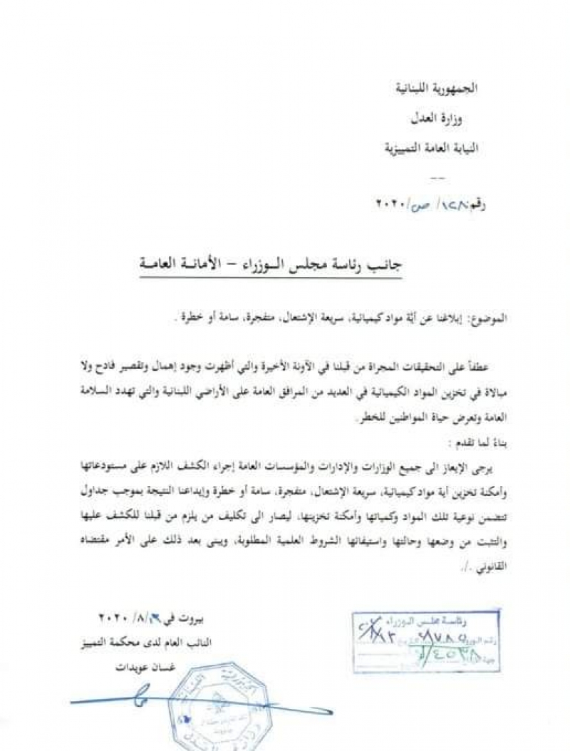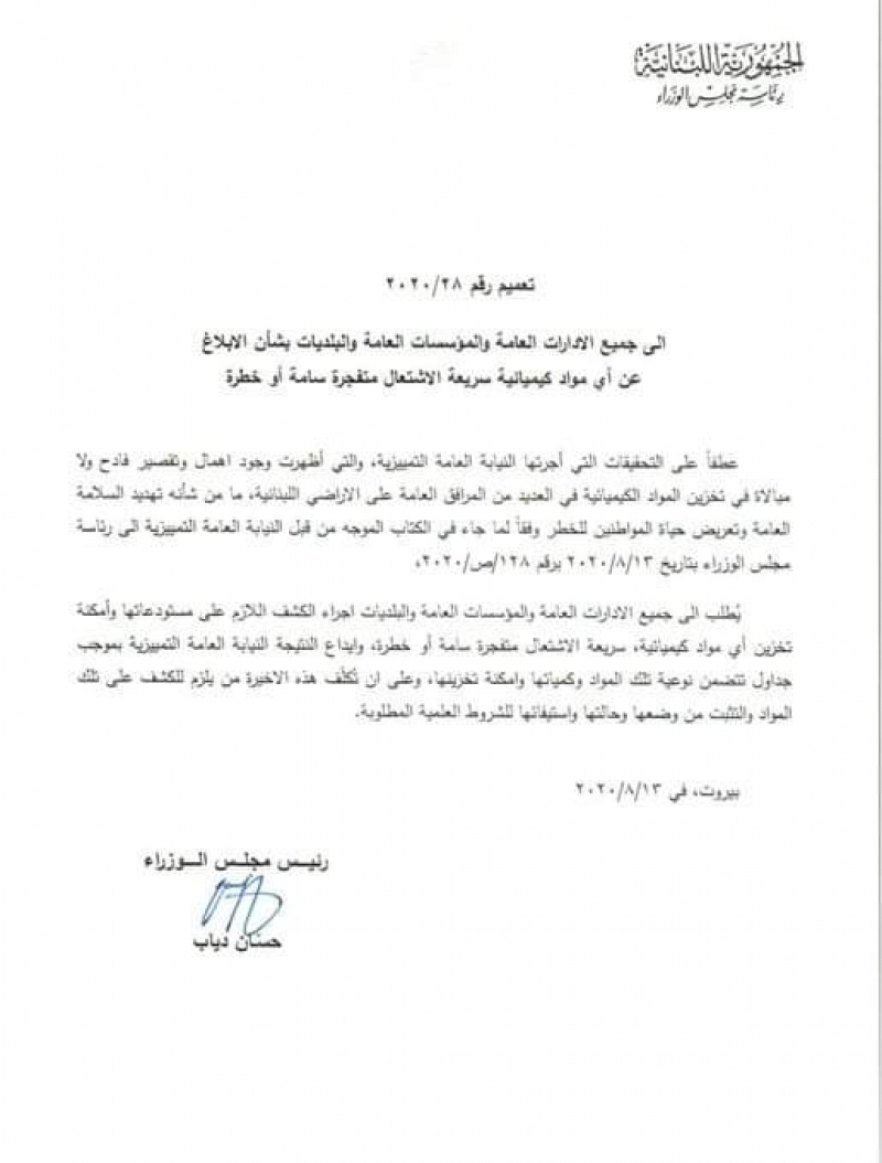 اصدر الرئيس دياب تعميم إلى جميع المؤسسات العامة والإدارات العامة والبلديات بشأن الابلاغ عن أي مواد كيميائية سريعة الإشتعال متفجرة سامة أو خطرة
