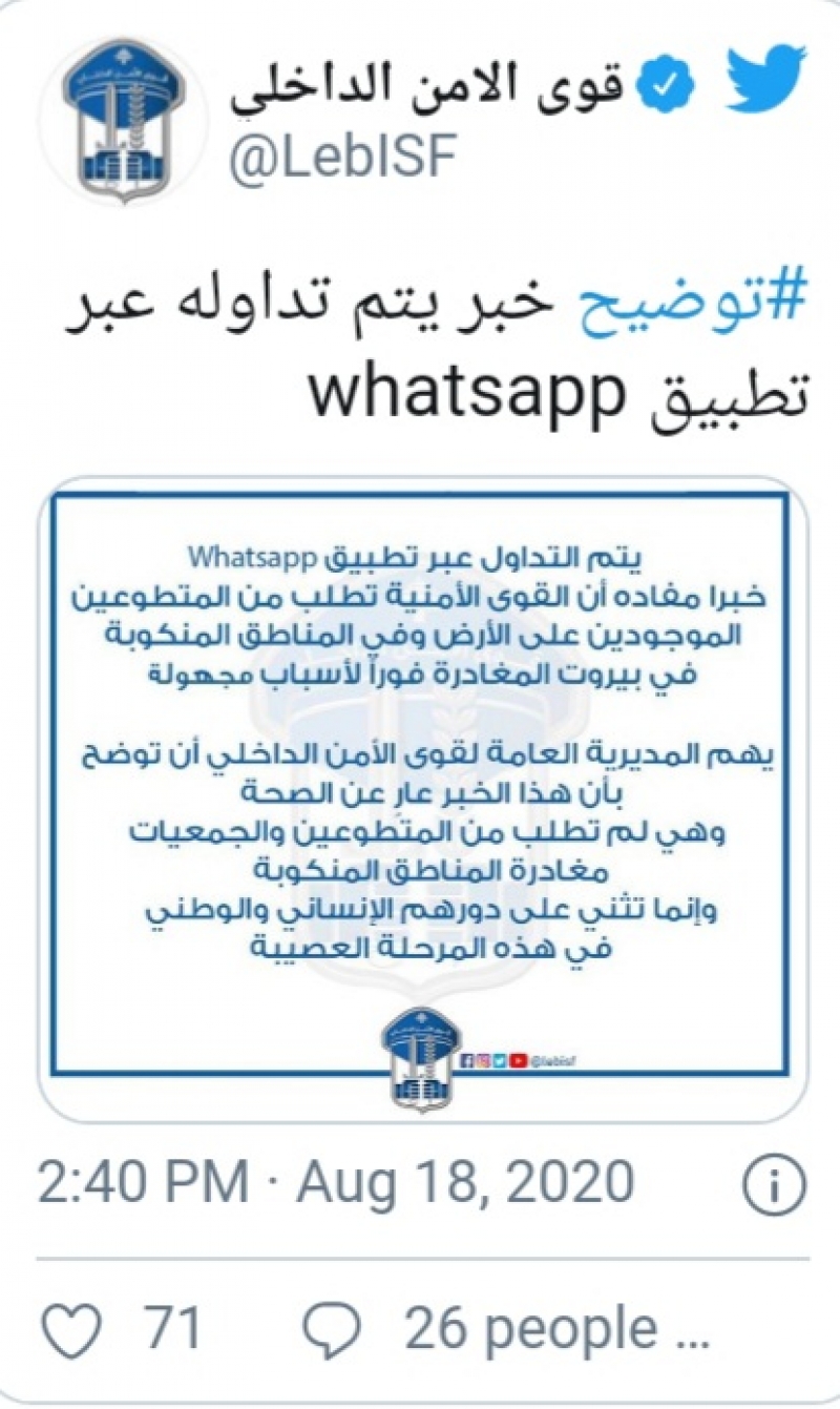أعلنت قوى الأمن الداخلي في تغريدةٍ على حسابها عبر "تويتر"، أنه "يتم التداول عبر تطبيق "Whatsapp" خبراً مفاده أن القوى الأمنية تطلب من المتطوعين الموجودين على الأرض وفي المناطق المنكوبة في بيروت، المغادرة فورا لأسباب مجهولة"، يهم المديرية العامة، أن "توضح بأن هذا الخبر عار عن الصحة وهي لم تطلب من المتطوعين والجمعيات مغادرة المناطق المنكوبة، وإنما تثني على دورهم الإنساني والوطني في هذه المرحلة العصيبة قوى الأمن الداخلي".
