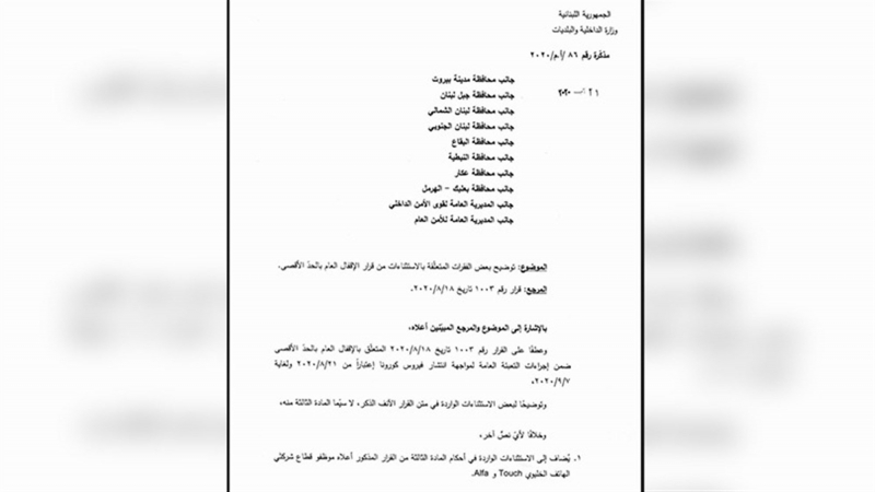 أصدر وزير الداخلية والبلديات العميد محمد فهمي مذكرة تتعلق بإستثناءات جديدة من قرار الاقفال.