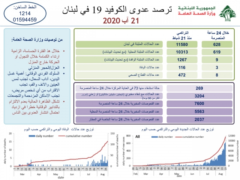 وزارة "الصحة العامة" اللبنانية: تسجيل 628 اصابة جديدة بفيروس كورونا و 3 حالات وفاة في الـ24 ساعة الماضية
