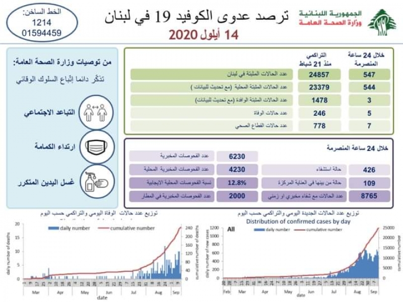 وزارة الصحة: تسجيل 547 حالة كورونا و5 وفيات خلال الـ24 ساعة الأخيرة في لبنان